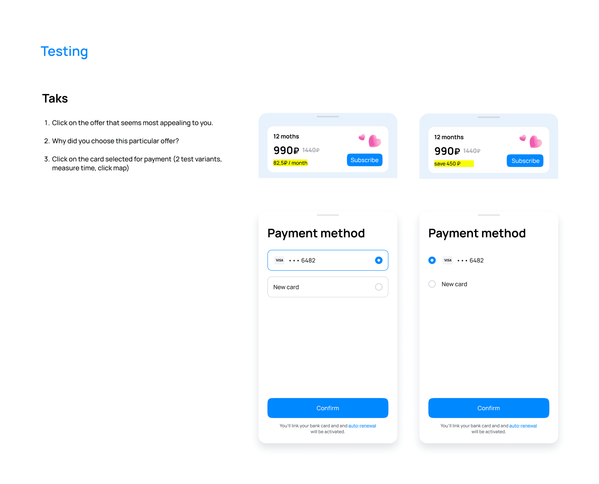 Improved payment transparency: Previously, churn users couldn’t see which card would be charged, leading to hesitation. I added a clear preview step showing the selected payment method before confirmation, which increased user trust and contributed to higher conversion rates.